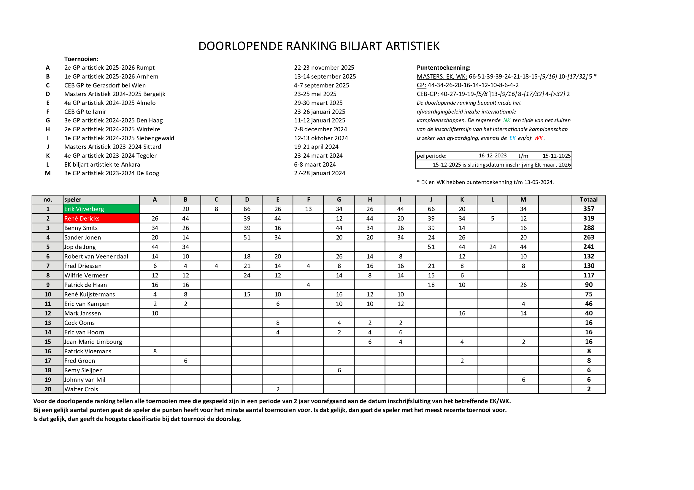 • De doorlopende ranking is gebaseerd op de sluitingsdatum van inschrijving voor het EK biljart artistiek dat in maart 2026 gehouden zal worden in Antalya.