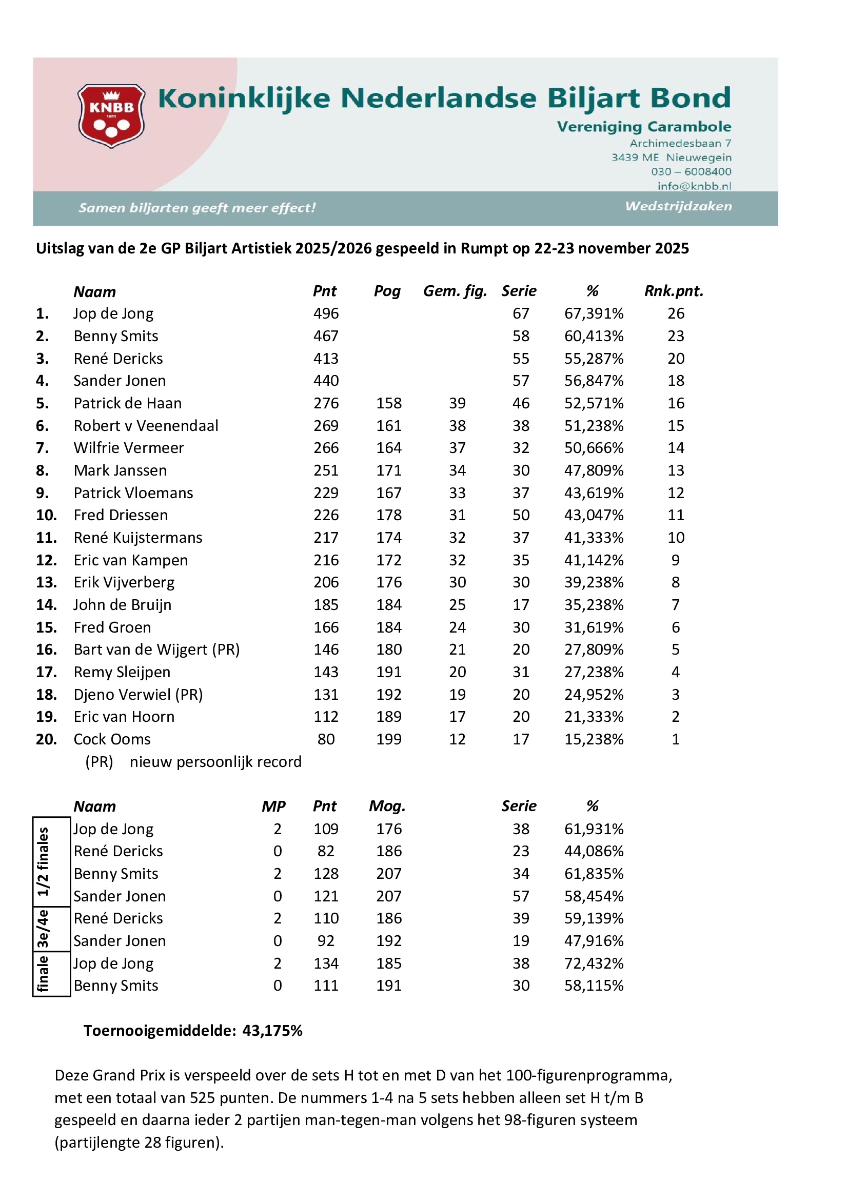 • Jop de Jong en René Dericks troffen elkaar ditmaal in de halve finale (bij de eerste GP speelden zij de finale tegen elkaar). René stond het grootste gedeelte van de partij voor. In het 17e figuur trok Jop de stand gelijk (76 tegen 76). Bij het 20e figuur kwam Jop op een voorsprong die hij niet meer uit handen gaf. Deze partij duurde 25 figuren. De door Jop opgebouwde voorsprong kon toen niet meer worden ingehaald door René.