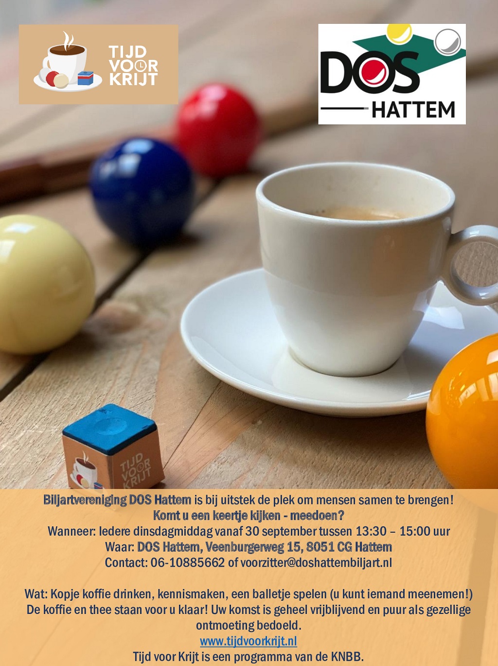 - Contactpersoon: Louis van Jole, voorzitter DOS Hattem per mail voorzitter@doshattembiljart.nl of telefonisch 06-10885662