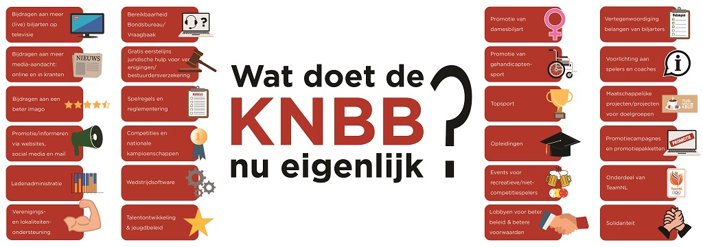 Ondanks al het bovenstaande stellen biljarters en clubs toch nog vaak de vraag: wat doet de KNBB eigenlijk voor ons? In deze tekst (die momenteel wordt verwerkt tot een mooie folder) een overzicht van onze activiteiten – en waarom deze activiteiten zo belangrijk zijn.